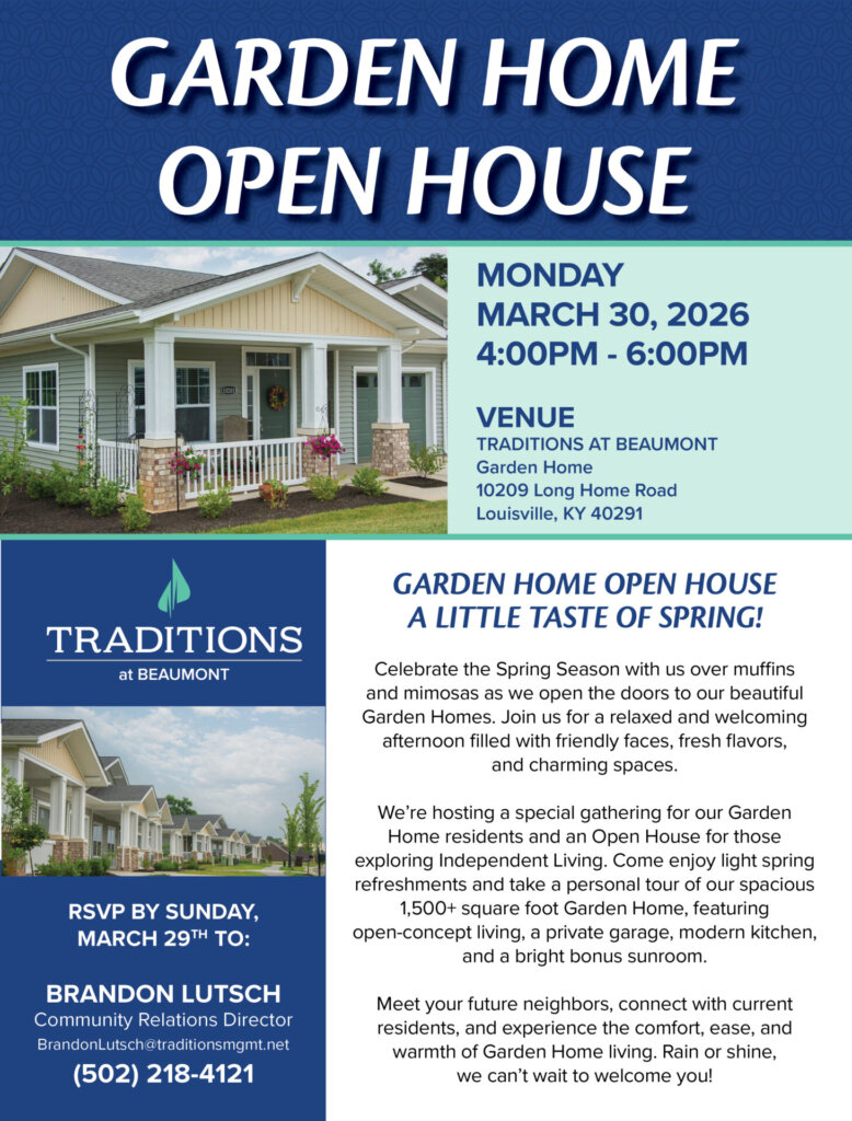 We’re hosting a special gathering for our Garden Home residents and an Open House for those exploring Independent Living. Come enjoy light spring refreshments and take a personal tour of our spacious 1,500+ square foot Garden Home, featuring open-concept living, a private garage, modern kitchen, and a bright bonus sunroom.
